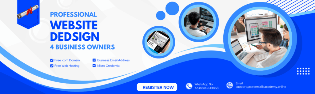 Build your professional online presence fast with step-by-step guidance, live training, and free tools. Included are all you need to go live: free ‘.com’ domain, web hosting, business email, and certificate. Just for ₦25,000 only. No tech experience needed. No AI generated website required. Learn the real-world trending website design skill. Give that idea maximum visibility.